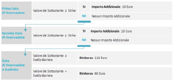 Se al termine del primo anno (Prima Data di Osservazione) tutti gli indici sono pari o superiore allo Strike il Certificate paga 10 Euro. In caso contrario occorrerà verificare cosa accade al termine del secondo anno (Seconda Data di Osservazione).