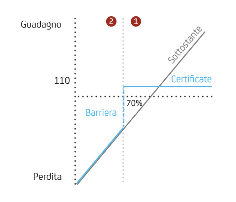 • Scenario 2 – Se al meno uno degli indice è inferiore al livello Barriera (ovvero è inferiore al suo valore alla data di emissione e registra una performance negativa superiore al 30%) il Certificate rimborsa il prezzo di emissione decurtato della variazione negativa realizzata dal sottostante peggiore (Ad esempio se la variazione del sottostante è pari a -40% il Certificate rimborsa 60 Euro).