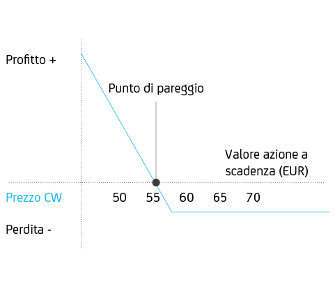 Il grafico seguente mostra il profilo del profitto (Valore di Rimborso - Premio CW) di un Covered Warrant Put su un’azione A (strike 60) in funzione di tutti i possibili prezzi del sottostante all’esercizio (nell’ipotesi che A sia un’azione quotata in Euro).