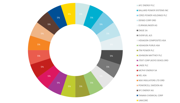 L’indice comprende fino a 25 aziende attive nel settore dello sviluppo e produzione di idrogeno, motori a idrogeno, celle a combustibile e batterie per veicoli. I componenti dell’indice sono quotati in Canada, Giappone o Europa. In termini di liquidità, hanno una capitalizzazione di mercato superiore a 150 mln EUR e un volume di scambi giornalieri superiore a 200.000 EUR.